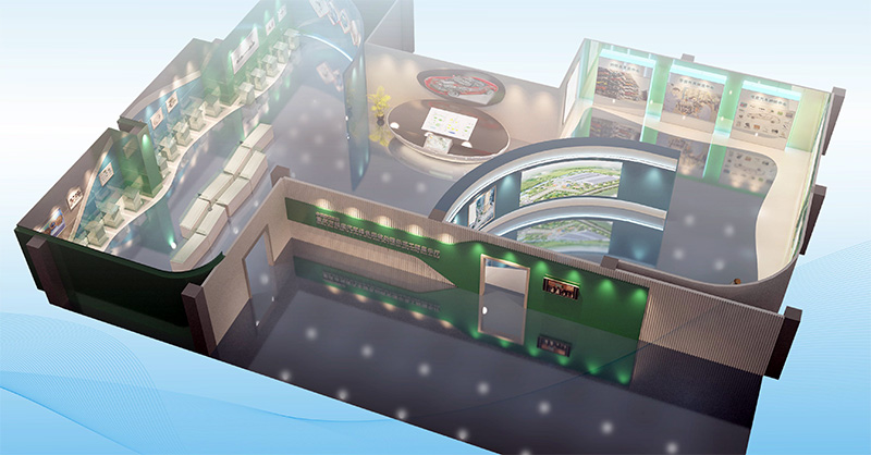 本展廳面積為30平米,參觀路線采用閉合型單向路徑方式,分為序廳、產(chǎn)業(yè)背景、行業(yè)標(biāo)桿、工藝流程、變廢為寶、樣品展示、未來規(guī)劃七大部分。