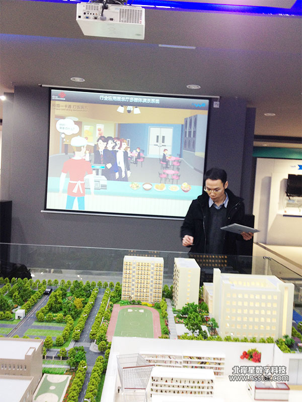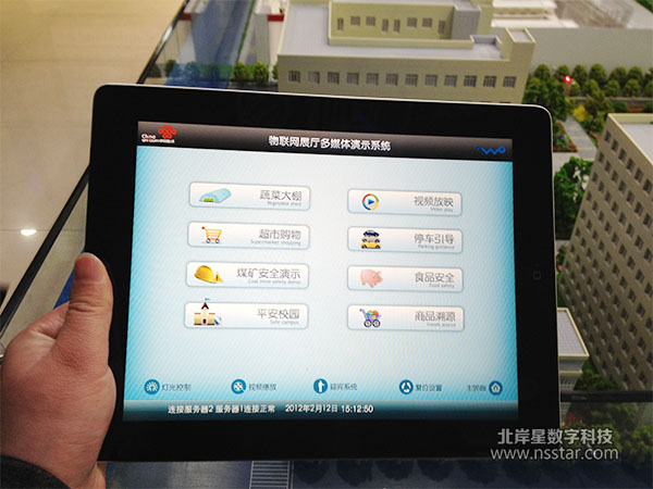 系統(tǒng)主要包含的演示控制軟件有:迎賓自動識別簽到系統(tǒng)、視頻放映廳、蔬菜大棚、豬肉食品溯源、煤礦安全系統(tǒng)演示、停車引導(dǎo)系統(tǒng)、商品溯源系統(tǒng)、超市購物系統(tǒng)、校園一卡通、校園入侵檢測等應(yīng)用演示。使用到的技術(shù)主要有:蘋果ipad平板電腦控制展廳內(nèi)所有應(yīng)用演示、多臺服務(wù)器及軟件、展廳及沙盤燈光、投影機演示;RFID即時讀取信息、沙盤溫度濕度傳感器、視頻監(jiān)控數(shù)據(jù)實時傳輸與拍照,報警等功能,并能和沙盤及投影機、ipad形成互動等多方面展示內(nèi)容。