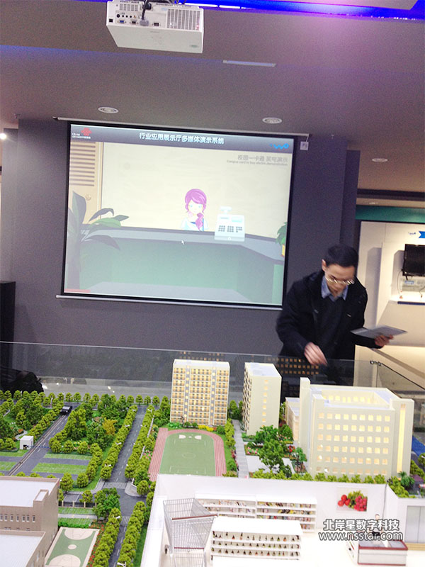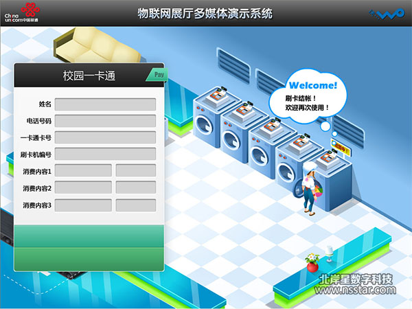 “校園一卡通”自動點餐、打水、洗衣、買電等功能沙盤聯(lián)動控制:用聯(lián)通手機在沙盤上的“校園食堂”處“晃一晃”,大屏幕上會自動顯示點餐演示系統(tǒng)。