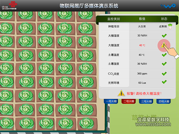 “蔬菜大棚”智能監(jiān)控系統(tǒng)演示:點擊iPad中控系統(tǒng)上的“蔬菜大棚演示”按鈕,投影畫面自動切到蔬菜大棚顯示界面。并調(diào)用沙盤上的實時數(shù)據(jù)(如濕度、溫度等)顯示在屏幕上。如果濕度過低,系統(tǒng)自動報警,提示到大屏幕上,音響系統(tǒng)出現(xiàn)報警聲音。當(dāng)操作員點擊“噴水”按鈕,沙盤上的噴頭會自動噴水到蔬菜上,當(dāng)濕度到達預(yù)定值時,噴頭自動停止噴水,數(shù)據(jù)恢復(fù)正常。溫度控制系統(tǒng)的原理和濕度一樣,當(dāng)溫度過低,系統(tǒng)會提示打開燈光。