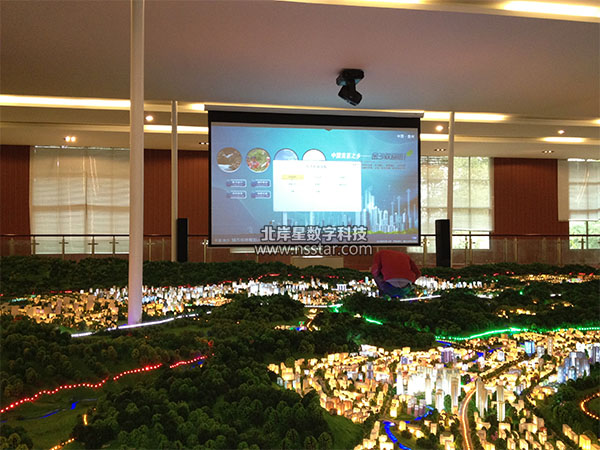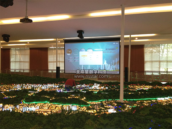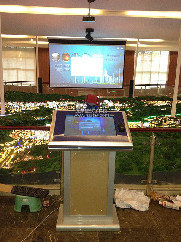本系統(tǒng)采用宏基10寸掌上電腦+觸摸屏一體機+搖頭燈燈光渲染+大屏幕投影的方式服務(wù)于沙盤控制展示。除了可以控制100多路沙盤燈光以外,還展示了金沙城市規(guī)劃的詳細信息,包括金沙介紹、地理交通介紹、城市規(guī)劃、相關(guān)圖件、招商引資、視頻欣賞、語音解說等等全方面的內(nèi)容。配合光彩奪目的渲染燈,使整個展廳熠熠生輝。