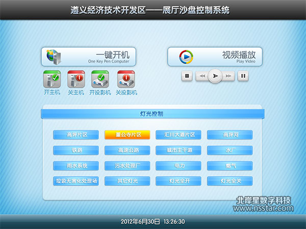 本系統(tǒng)采用蘋果iPad平板電腦控制展廳內(nèi)的所有數(shù)字設(shè)備,包括17米寬的投影拼接弧幕、100多平方的投影沙盤、以及燈光控制、主機(jī)控制等。