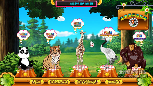 軟件中有5種動物參與互動:大熊貓、華南虎、長頸鹿、丹頂鶴、黃猩猩。當(dāng)游客對著大熊貓揮手時,屏幕中的大熊貓也會對著您微微笑、揮揮手。