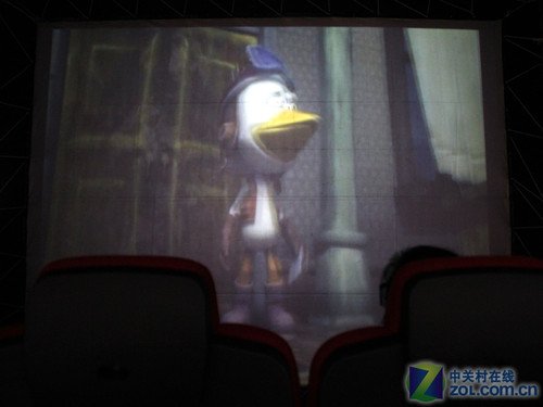 另一家集成商的展臺(tái)上,通過(guò)一款投影機(jī)在一塊背投幕上,投射出了清晰的電影畫(huà)面。采用了這項(xiàng)技術(shù)的影院,我們就不再擔(dān)心來(lái)回走動(dòng)會(huì)遮擋投影光線了。