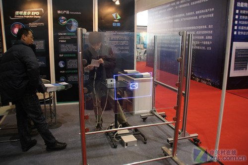 在展會(huì)現(xiàn)場(chǎng),一家系統(tǒng)集成商展示了自發(fā)光式全透明投影顯示(EPD)技術(shù)。在一塊特殊的透明材質(zhì)上,就可以投射出清晰的畫(huà)面。