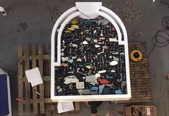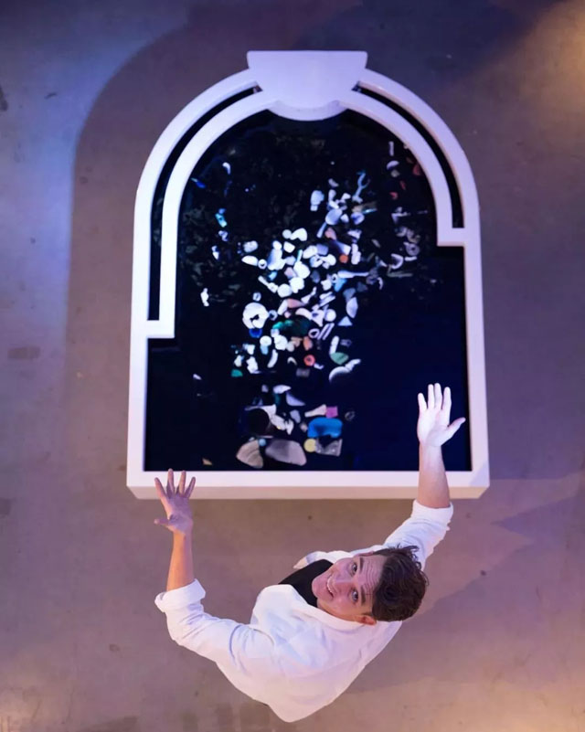“塑料反光鏡”是一個(gè)互動(dòng)力學(xué)裝置,是由來自世界各地的601件海洋里的塑料垃圾制成的。