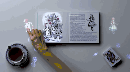 索尼未來(lái)實(shí)驗(yàn)室“Future Lab”將《愛(ài)麗絲夢(mèng)游仙境》打造成一本可互動(dòng)性故事書。翻開(kāi)書本,用戶可以拖動(dòng)故事里的紙牌人和小愛(ài)麗絲;當(dāng)用戶用手指劃過(guò)書中某個(gè)句子時(shí),它會(huì)立即放大出現(xiàn)在桌子上;在書旁放上物品,周邊環(huán)境也會(huì)隨之發(fā)生改變。