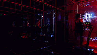 在這個(gè)空間內(nèi)安放了8臺(tái)跑步機(jī),Monomango團(tuán)隊(duì)對(duì)跑步機(jī)進(jìn)行了改造并開(kāi)發(fā)了一個(gè)互動(dòng)場(chǎng)景,他們?cè)诿總(gè)跑步機(jī)前配備了一個(gè)全息投影,觀眾的跑步動(dòng)作會(huì)被實(shí)時(shí)追蹤并以全息投影的形式呈現(xiàn)在體驗(yàn)者面前。除此之外,體驗(yàn)者還可以感受到目前世界上跑得最快馬拉松運(yùn)動(dòng)員Eliud Kipchoge的跑步速度,以此增加運(yùn)動(dòng)的趣味性。