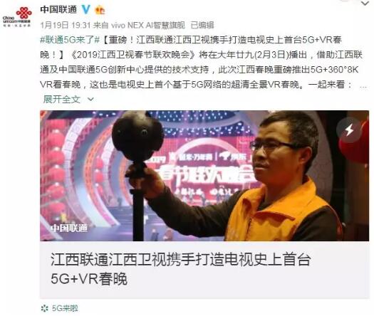 1月19日消息,中國聯(lián)通官方宣布,2019江西衛(wèi)視春節(jié)聯(lián)歡晚會(2月3日播出)重磅推出5G+360°8K VR看春晚,這是電視史上首個基于5G網(wǎng)絡(luò)的超清全景VR春晚。