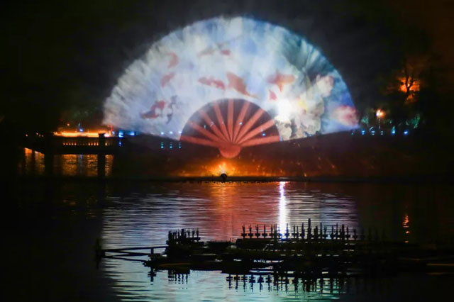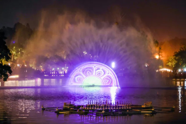 玉湖景區(qū)3D噴泉投影燈光秀新會(huì)首期亮化工程中“兩極一軸”的“城市創(chuàng)新極”的亮點(diǎn)。燈光秀以“古城新篇 攬景勝會(huì)”為主題,通過六個(gè)篇章,串起新會(huì)文化脈絡(luò)。