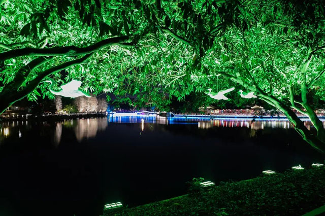 玉湖燈光秀周圍的山體、湖岸、園林、橋梁、亭臺(tái)樓閣,也按最佳觀賞點(diǎn)來確定亮度的層次劃分,對(duì)公園、廣場、周邊建筑、橋梁、湖岸、雕塑等進(jìn)行了全要素的亮化提升,給予市民一個(gè)全新的夜景體驗(yàn)。