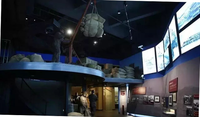 走進(jìn)新升級后的現(xiàn)當(dāng)代港口廳,濃重的時代感撲面而來:幾個工人正在碼頭上勞作,抬起頭,看到工人們正在操作極具年代特征的“少先吊”,將貨物高高吊起,讓人仿佛置身于上世紀(jì)五十年代的碼頭。