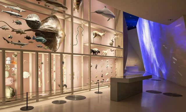 “卡塔爾的自然環(huán)境”展示了各類(lèi)土壤植物及動(dòng)物的標(biāo)本和模型,包括阿拉伯劍羚、沙丘貓、殺人蝎、以及魚(yú)類(lèi)中體型最大的長(zhǎng)達(dá)9米的鯨鯊。在導(dǎo)演Christophe Cheysson和傳奇電影制片人Jacques Perrin創(chuàng)作的萬(wàn)花筒一般的影片《陸地和海洋,2017》(Land and Sea, 2017)中,飛鳥(niǎo)布滿了50米寬的天空,魚(yú)群在深處游動(dòng),風(fēng)暴震撼感官。