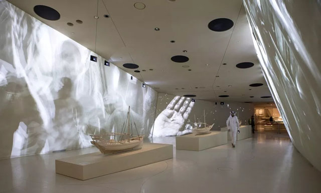 口述歷史紀(jì)錄片、檔案照片、地圖、文本、模型以及數(shù)字化學(xué)習(xí)中心等全方位的資料為參觀者呈現(xiàn)了卡塔爾歷史及遺產(chǎn)中最為人矚目的寶藏。博物館委托眾多國(guó)際知名電影制片人制作了一系列藝術(shù)短片,通過(guò)生動(dòng)的形式為觀眾呈現(xiàn)豐富主題。每個(gè)高清巨幅短片均為動(dòng)態(tài)曲面的不規(guī)則墻面度身定制,令墻面成為移動(dòng)的舞臺(tái)。所有影片均有多哈電影學(xué)院使用尖端技術(shù)制作,并在卡塔爾境內(nèi)完成拍攝。