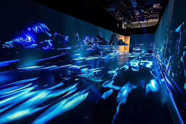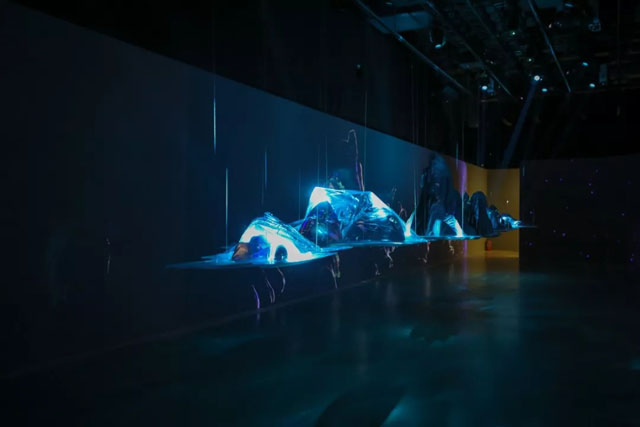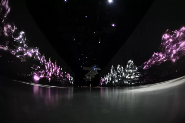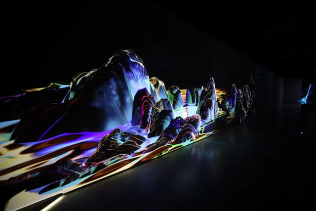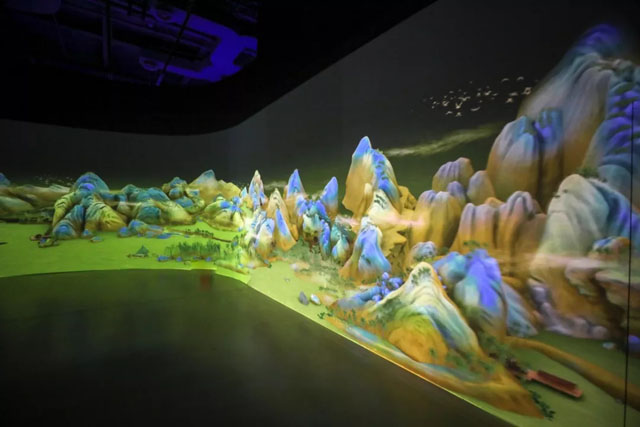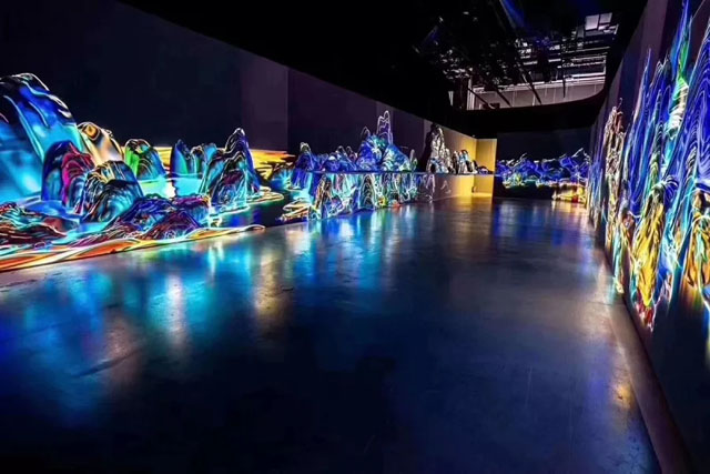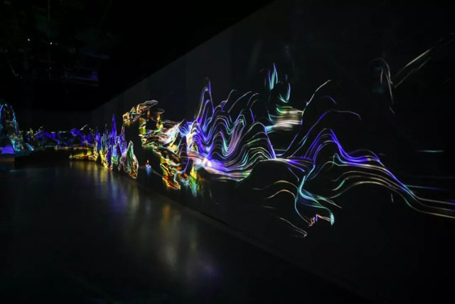 步入“千里江山圖”展廳,就宛若進(jìn)入了一個(gè)擁有生命力的銀河,閃亮的群星由遠(yuǎn)及近以動態(tài)的方式劃過宇宙,極致的縱深感讓參觀者仿佛觸碰不到展廳的“面”和“線”,只有“空間”和“時(shí)間”的高維感受。