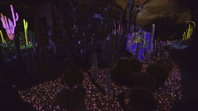 沙漠植物園的Electric Desert擁有七個(gè)獨(dú)立裝置。而Cacti Synthesia是其中一個(gè),利用投影和照明,將仙人掌、多肉植物和巖層變成了活生生的夜間畫布,使花園及其獨(dú)特的景觀作為新的和令人興奮的音頻和視覺體驗(yàn)的背景。