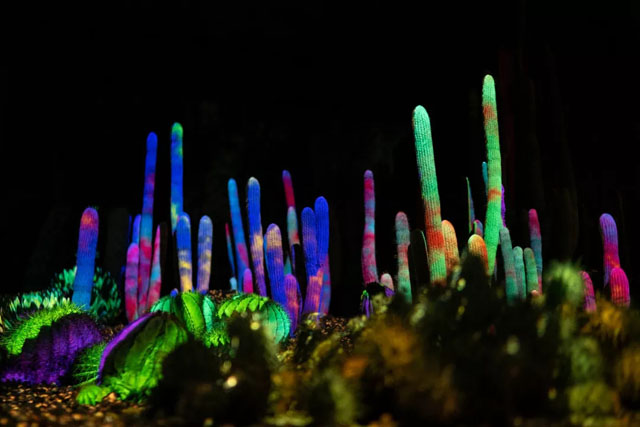 以仙人掌與沙漠為畫布,用投影的動(dòng)態(tài)光線畫面與音樂聯(lián)動(dòng),在夜間,創(chuàng)造了一場(chǎng)沙漠植物園中的沉浸式之旅。