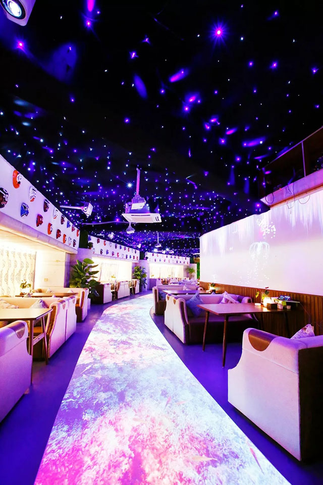 天花頂就像繁星一點(diǎn)一點(diǎn)亮著,墻面超長(zhǎng)熒幕時(shí)不時(shí)的切換著不同場(chǎng)景畫面,每一個(gè)餐位都是卡座,用餐時(shí)仿佛就像遨游在外太空~