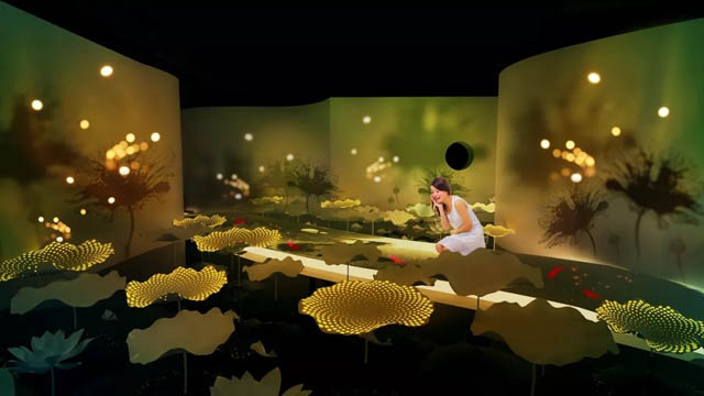 “秋陰不散霜飛晚,留得枯荷聽雨聲”。美妙荷田的情境,透過投影mapping技術(shù),投射斑斕的影像在荷葉上,帶來多層次豐富的視覺體驗。