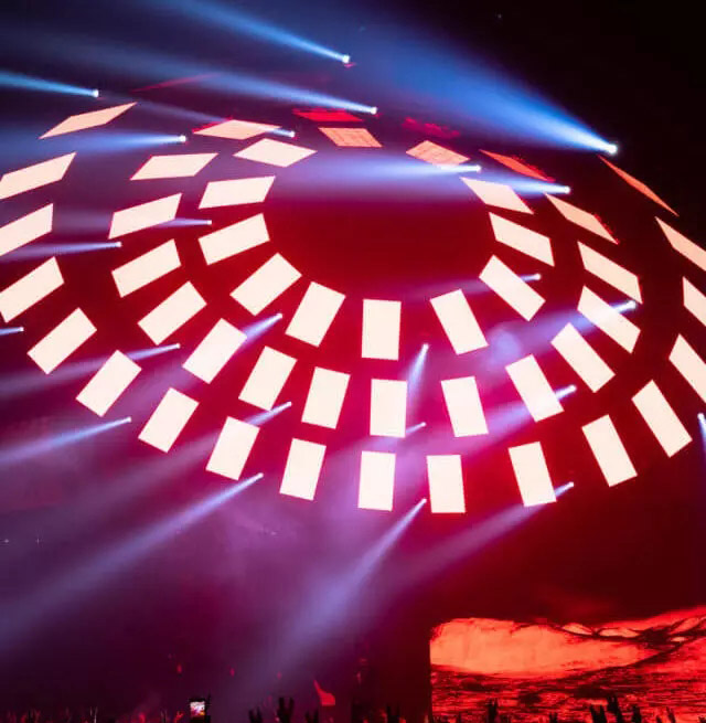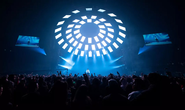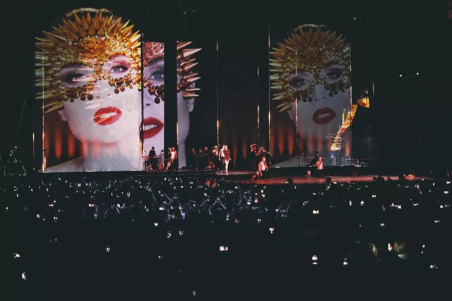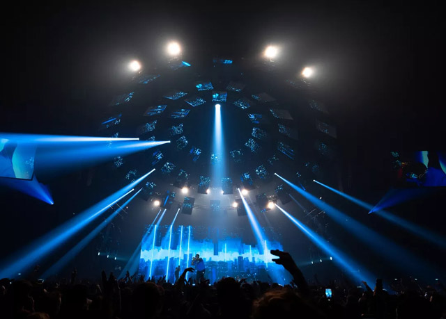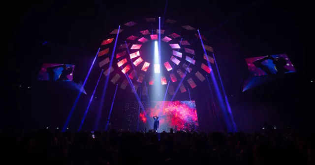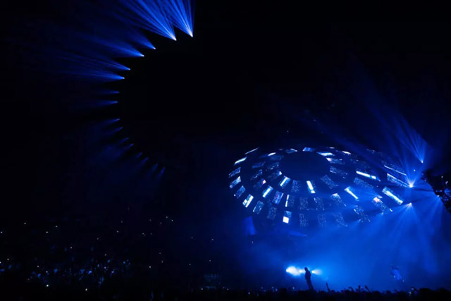 舞臺(tái)不需要太浮夸,簡(jiǎn)單點(diǎn),以表演者為中心就好。為此,設(shè)計(jì)師為他創(chuàng)造了一個(gè)令觀眾印象深刻的360°空間的舞臺(tái)。一個(gè)由52個(gè)視頻屏幕組成的大圓頂,懸掛在舞臺(tái)上方,并以視覺畫面為特色。