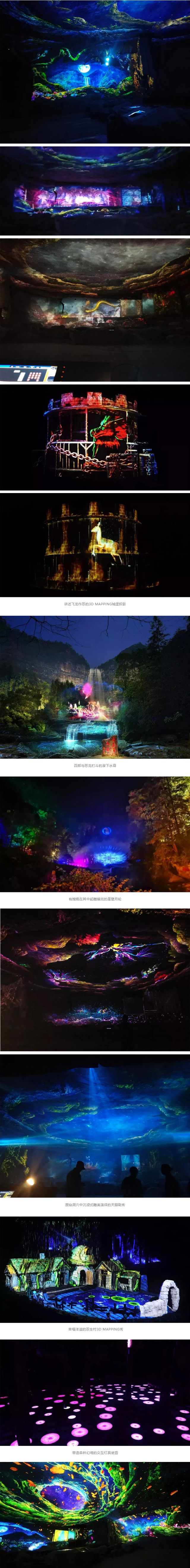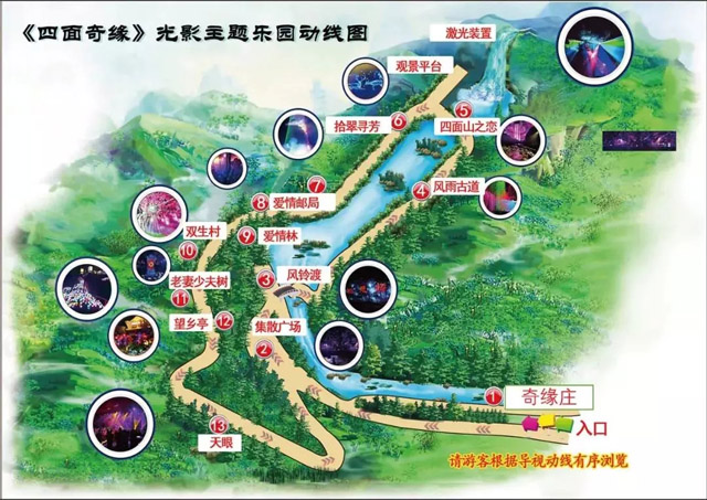通過策劃設(shè)計(jì)的投影方案,做到完全保護(hù)景區(qū)原始景觀的前提下,將懸崖峭壁、飛流瀑布,螢火森林等壯觀景色在夜色中綻放出另一番意境。根據(jù)“愛情天梯”的情節(jié)發(fā)展,故事動線1.4公里,沿動線分為13個(gè)故事節(jié)點(diǎn),設(shè)置24處光影應(yīng)用,游園約1.5h-2h,打造出“動靜結(jié)合、虛實(shí)結(jié)合、情景結(jié)合”的行走探險(xiǎn)式光影交互體驗(yàn)。