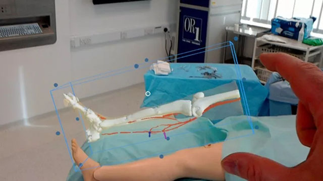 通過HoloLens眼鏡,將腿部CT掃描圖像中的骨骼和關(guān)鍵血管的位置準(zhǔn)確地覆蓋在病人的腿上,可以讓外科醫(yī)生在手術(shù)中能夠“透視”手術(shù)部位。