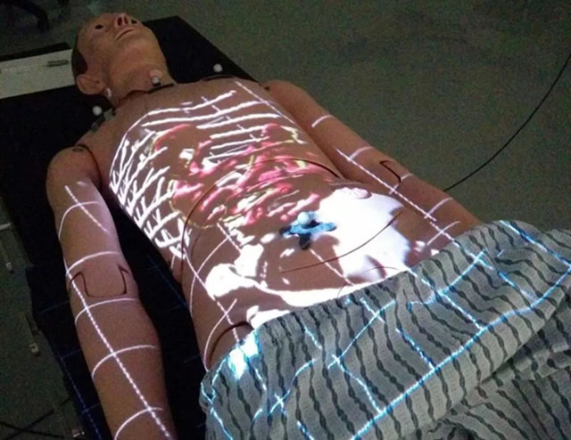 該系統(tǒng)可以將CT掃描和MRI數(shù)據(jù)等醫(yī)學(xué)圖像直接顯示在患者身體上,并與患者相應(yīng)部位相對應(yīng),通過軟件定位實現(xiàn)讓圖像可以隨患者移動而同步移動。這樣可以讓醫(yī)生全面了解患者的內(nèi)部解剖結(jié)構(gòu),直觀地看到骨骼和各部位器官。