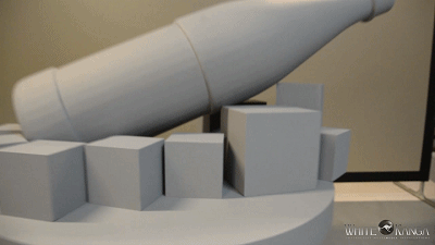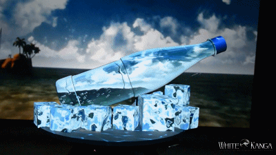 該投影秀的裝置設(shè)計(jì)原理并不復(fù)雜。一組純白色的模型,包括真實(shí)比例的礦泉水瓶形狀,底座四周布滿(mǎn)大大小小的“冰塊”。模型被安置在一個(gè)扁形圓柱底座上,底座可隨著投影背景緩緩轉(zhuǎn)動(dòng)。