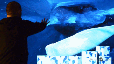 這不是一場(chǎng)只能觀看的投影秀,出了觀看體驗(yàn)者還可以與投影動(dòng)畫(huà)進(jìn)行互動(dòng)。在深海投影環(huán)節(jié),一只水母在礦泉瓶?jī)?nèi)游動(dòng),體驗(yàn)者可以伸手?jǐn)[動(dòng)控制水母怎么移動(dòng),還可雙手推動(dòng)令海水瞬間結(jié)冰。
