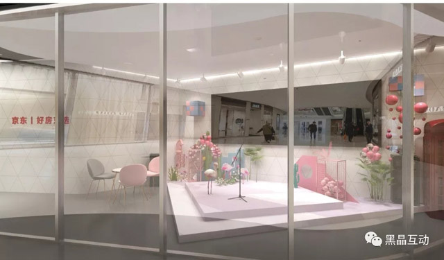 入口一側(cè)設(shè)置家居客廳場景,把京東家電產(chǎn)品客廳等所需智能化家電產(chǎn)品融入場景中,打造京東智慧生活雛形。