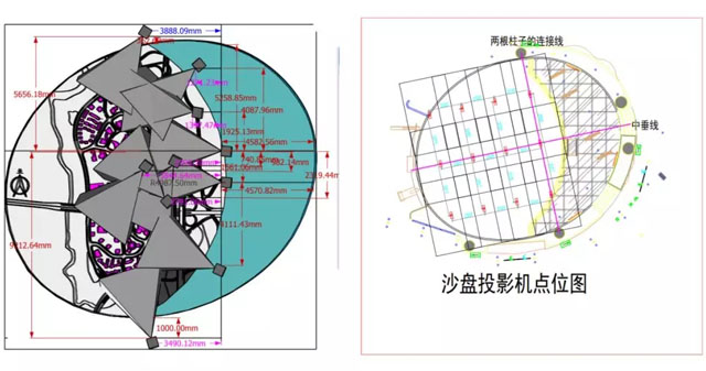 從上圖中可以看到,投影機的點位分布十分復雜。沙盤建筑體與沙盤地面、背景弧幕三部分片源要相互融合才能達到理想中的效果。