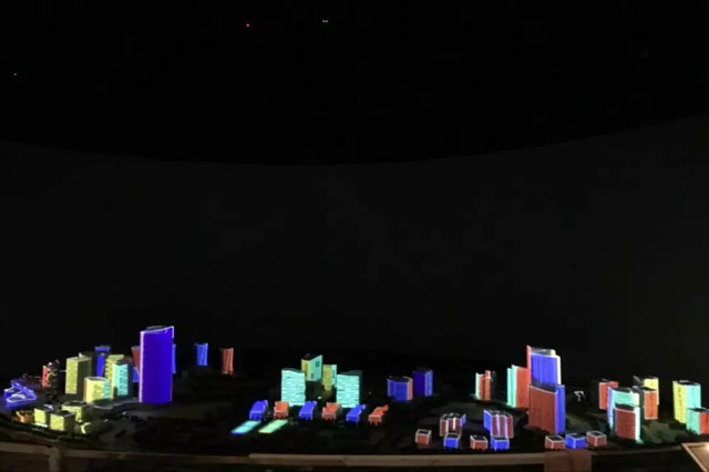背景弧幕由3臺7,200流明的松下PT-FRZ78C做融合,沙盤上的建筑物采用10臺5,400流明的松下激光機PT-FRZ570C進行投射,剩下的12臺松下PT-FRZ570C用于投射沙盤地面。