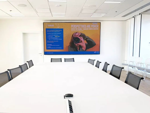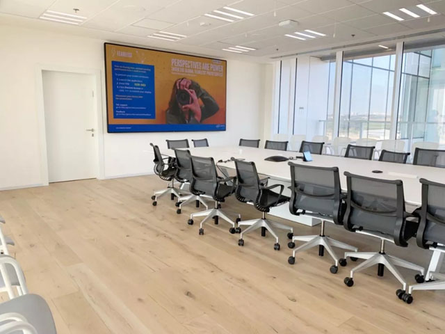 CEO辦公室三面均為透明玻璃窗,光線明亮,傳統(tǒng)投影機等設備在展現(xiàn)內(nèi)容時極易受環(huán)境光影響,呈現(xiàn)泛白模糊,無疑無法解決英特爾的痛點。而Absenicon 擁有高亮度、高對比度、高清晰度等先天優(yōu)勢,在明亮的環(huán)境下依然擁有卓越的顯示效果,而且色彩艷麗,能夠打造一個明亮、開放、高效的會議環(huán)境,帶來更加優(yōu)質(zhì)的會議體驗。