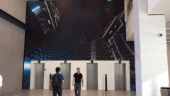 最有意思的是,大廳主屏還可與觀眾智能互動。觀眾在大廳做動作,比如招手、走動等,均能顯示在大屏幕上,并與不同展示主題的場景完美融合,極大刺激觀眾的興趣。