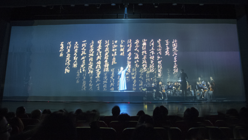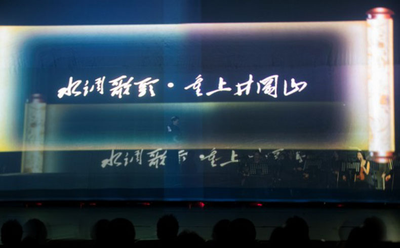 整場演出突破以往傳統(tǒng)劇目創(chuàng)作手法,緊跟時代,推陳出新,運用蘇州評話和蘇州評彈結合交響樂隊,使用全新舞美、全息投影的藝術形式來貫穿舞臺,特別是全息投影將毛體書法呈現(xiàn)在空氣幕布,洋洋灑灑,氣勢非凡,美輪美奐。傳統(tǒng)評彈與西洋音樂的結合不僅給觀眾帶來視、聽的美好感受,也在評彈與現(xiàn)代舞臺的結合方面做了創(chuàng)新實踐,使得年輕人能夠喜歡并接力綻放評彈藝術。