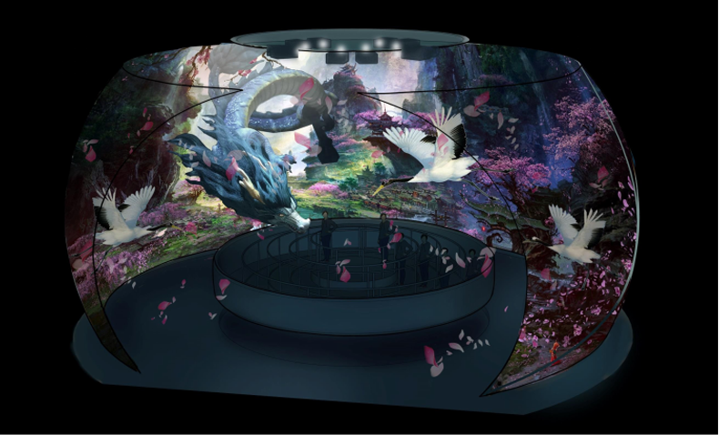 同時(shí)在“飛天之吻”一旁,還有由深圳星火互娛數(shù)字科技有限公司打造的360度動(dòng)感環(huán)幕立體影院項(xiàng)目,影院形似“鉆石”,象征愛情恒久彌堅(jiān)。