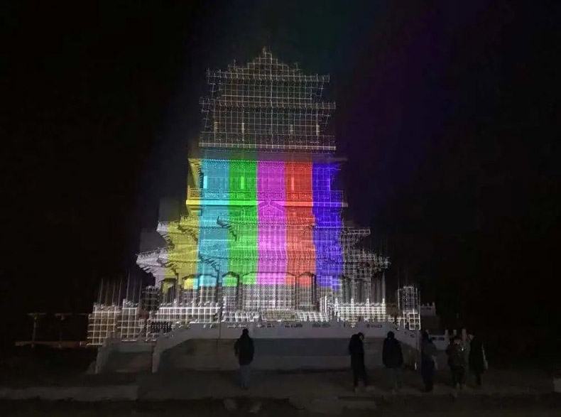 以引云閣為代表的傳統(tǒng)結(jié)構(gòu)歷史建筑,成倍增加效果落地的難度,不僅要確保投影與樓體完美吻合,亦要保證畫面的流暢與美觀。本次現(xiàn)場(chǎng)使用多臺(tái)超高流明的投影機(jī)從不同區(qū)域兩倍疊加,結(jié)合多通道的無縫融合,確保投影的高質(zhì)量。并引入“3D視效”“顏色亮麗動(dòng)效”、“人物光圈”等令人驚艷的創(chuàng)新技術(shù),為古建注入新維度,美輪美奐的詮釋大縱湖千年滄桑。