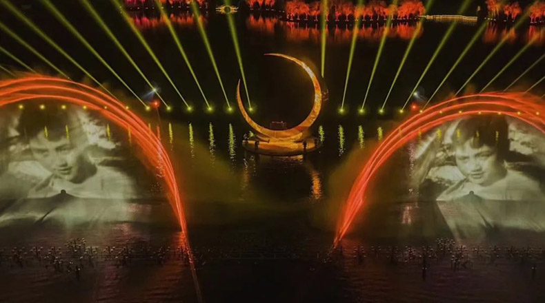 以鹽城最富盛名的平湖秋月之景為基,以傳唱幾代人的紅色經(jīng)典愛情故事為魂,通過直徑12米的“平湖秋月”地標(biāo)景觀裝置配合國(guó)內(nèi)僅見的多層級(jí)實(shí)景秀場(chǎng),融入現(xiàn)代舞美的再制,演繹蕩氣回腸的紅色革命故事,深度詮釋大縱湖新人文符號(hào)。