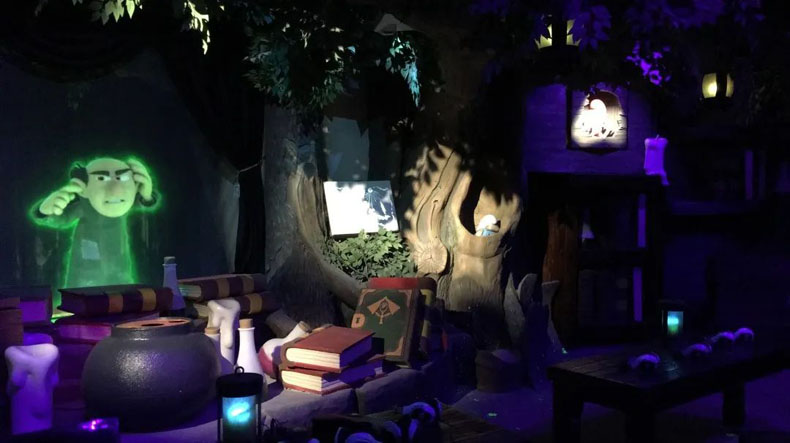 在“勇闖魔音亭”項(xiàng)目中,為了讓游客體驗(yàn)“真實(shí)”的“藍(lán)精靈世界”,項(xiàng)目采用高新投影及成像技術(shù)讓格格巫和藍(lán)精靈的形象“躍然紙上”。