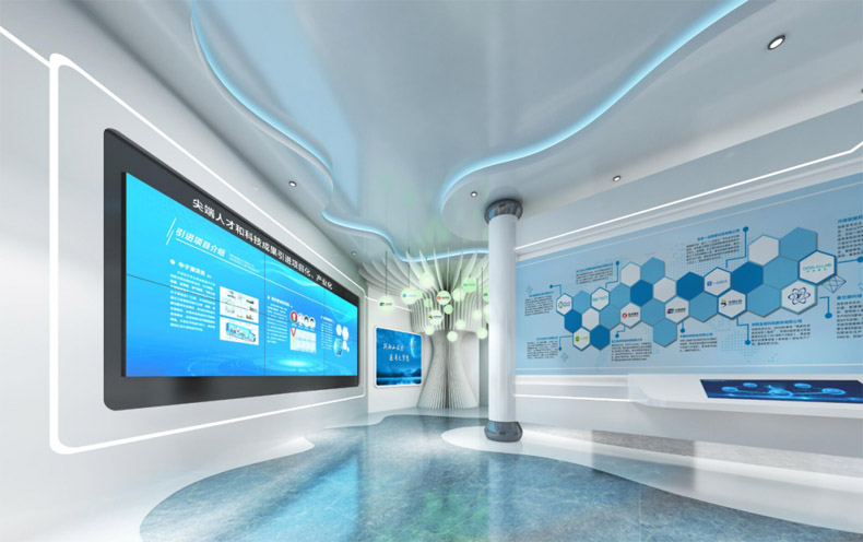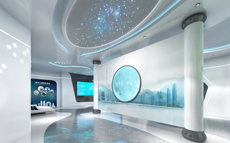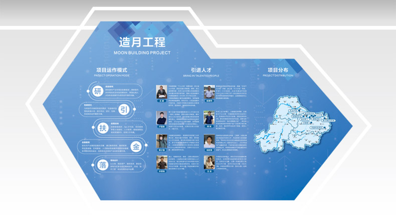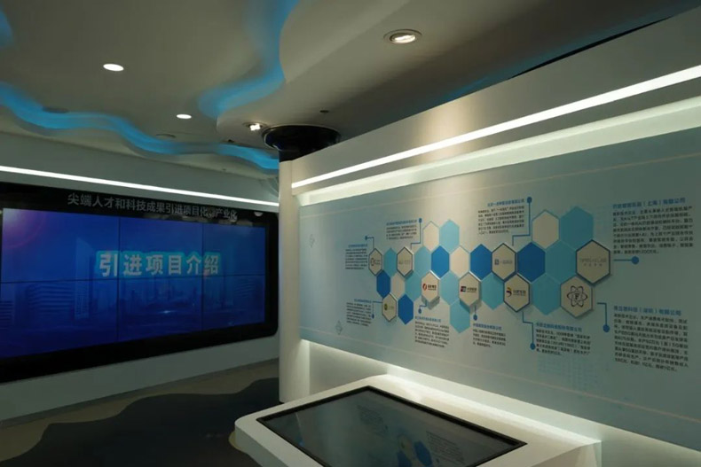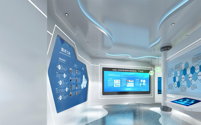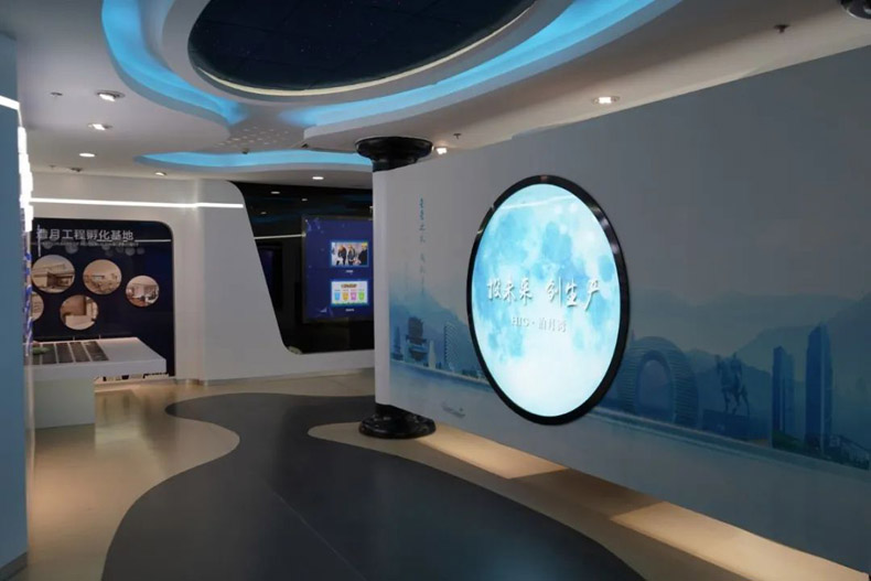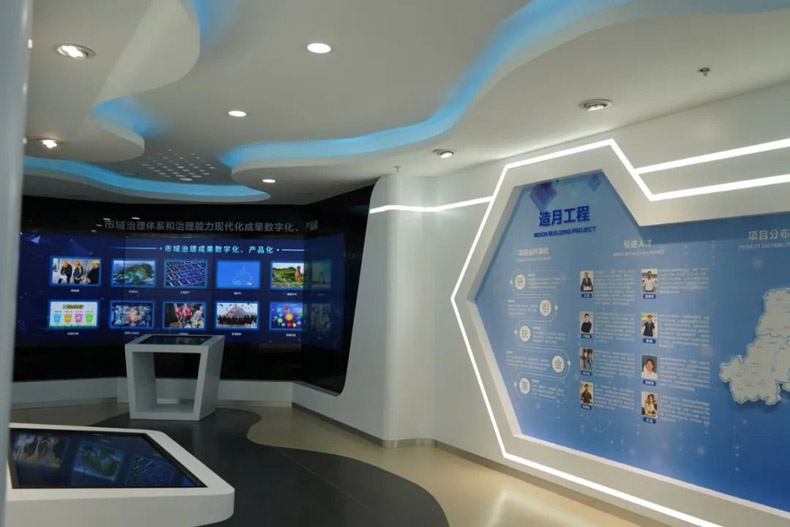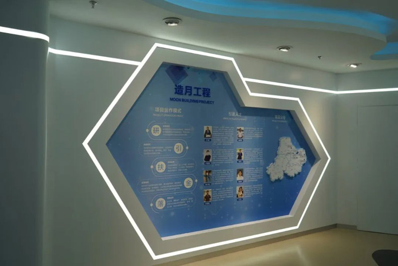 展示形式:使用2x3拼接屏+觸摸一體機(jī)+展示柜臺(tái)+圖文展板,展示泊月灣引進(jìn)投資的高端人才、科技項(xiàng)目及“造月工程”運(yùn)作模式。