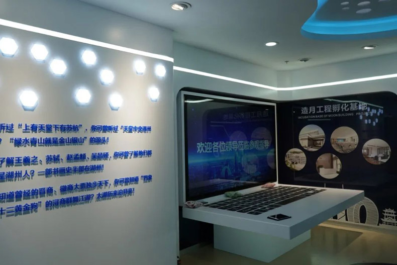 展示形式:以“星空、月亮”體現(xiàn)展廳“月亮空間”的主題,以“太湖水、地標(biāo)IP”突顯湖州風(fēng)韻,“星星之火,成就“月亮”,HIG·泊月灣,投未來、創(chuàng)生產(chǎn)”彰顯了泊月灣公司的使命擔(dān)當(dāng)。闡述“泊月灣緣起”“何為泊月灣”。