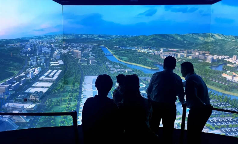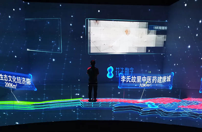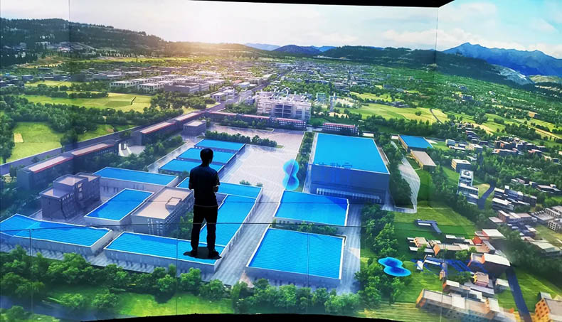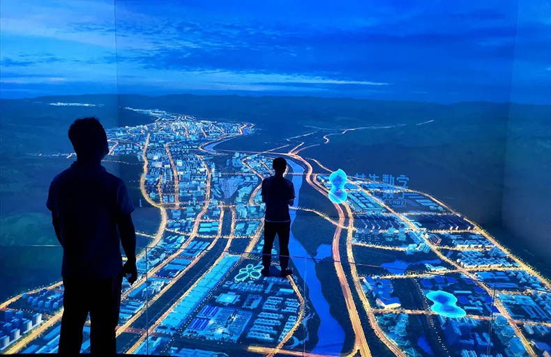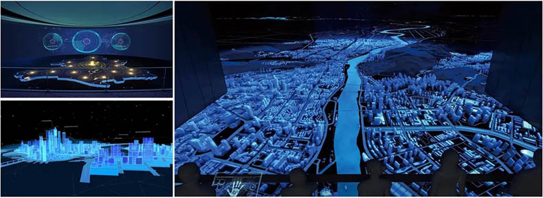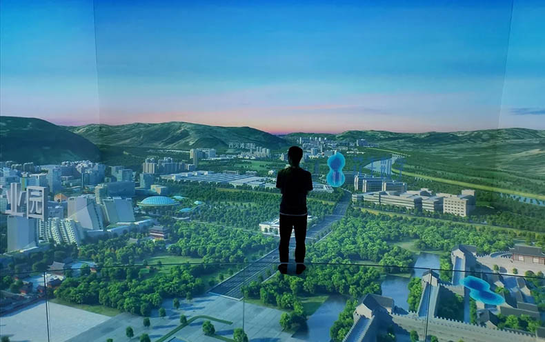 由四幅投影屏幕組成,配合數(shù)字化沙盤及內(nèi)容共同展示。比實(shí)體沙盤更具沉浸感和3D視覺效果,更能充分展示未來的規(guī)劃場景。配合聲、光、電等展示技術(shù),更具視覺沖擊效果,富有科技感,讓參觀者留下深刻的印象。
