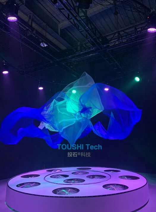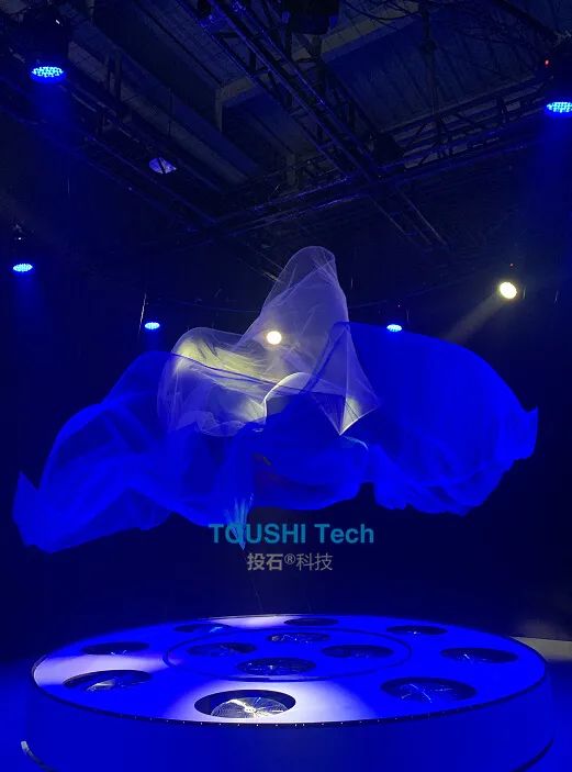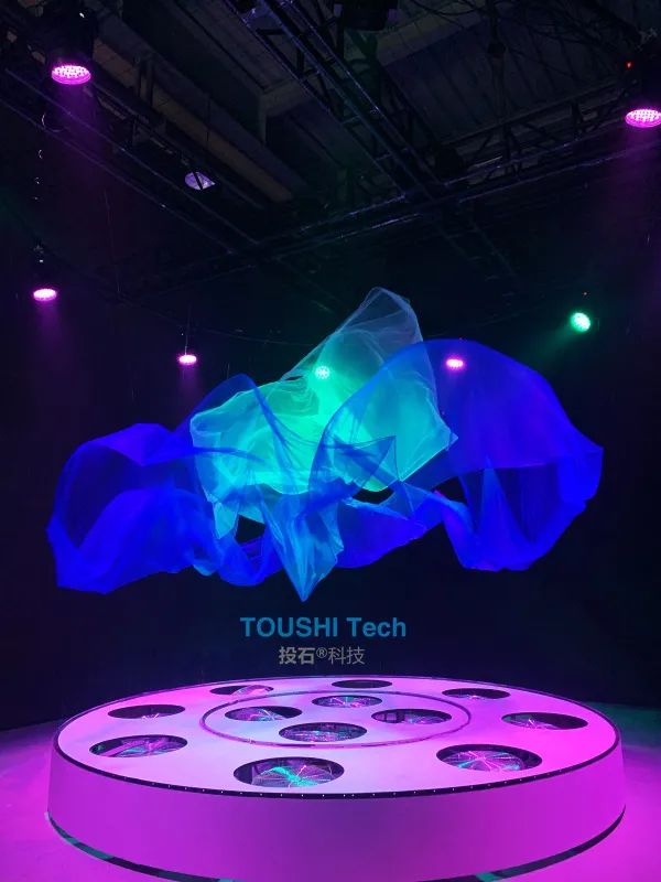 活動(dòng)中,投石科技通過對(duì)12臺(tái)電風(fēng)扇的精準(zhǔn)風(fēng)力控制內(nèi)環(huán)和外環(huán)的2塊紗幔,紗;(dòng)藝術(shù)裝置結(jié)合音樂和燈光,為觀眾帶來了一場實(shí)時(shí)的充滿藝術(shù)感的表演。