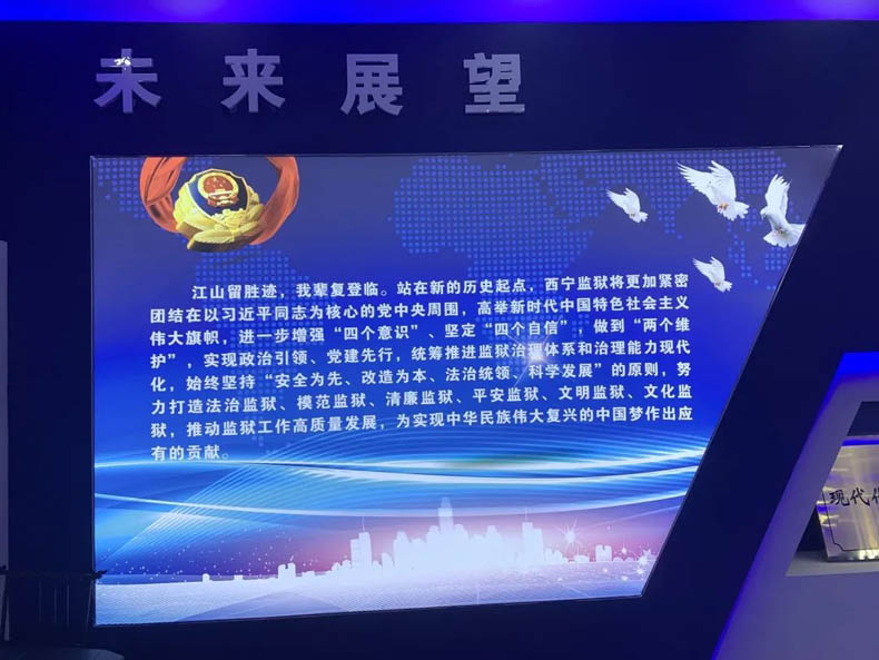 西寧監(jiān)獄陳列館通過大量的視頻、實物、圖文材料展現(xiàn)監(jiān)獄發(fā)展歷程,講好監(jiān)獄故事,弘揚監(jiān)獄精神,傳承紅色基因,集中展現(xiàn)了70年來監(jiān)獄改革發(fā)展的豐碩成果,更展現(xiàn)了西寧監(jiān)獄人堅定不移的理想信念、求真務實的工作作風、百折不撓的干事決心。未來陳列館將是西寧監(jiān)獄的一張靚麗名片,在向社會外界展示和宣傳中起到重要的作用。